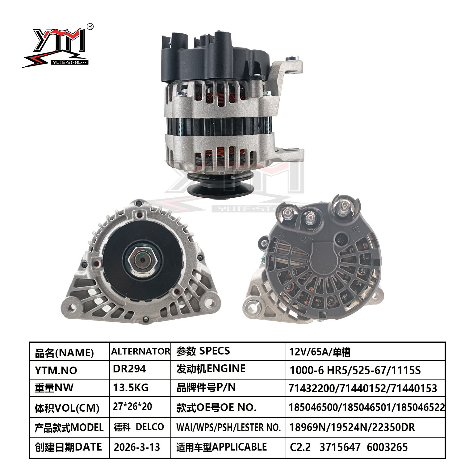 | ハイライト: | DELCO C2.2 car alternator 12V 65A,DELCO alternator 71432200 with warranty,car engine alternator 185046500 compatible |