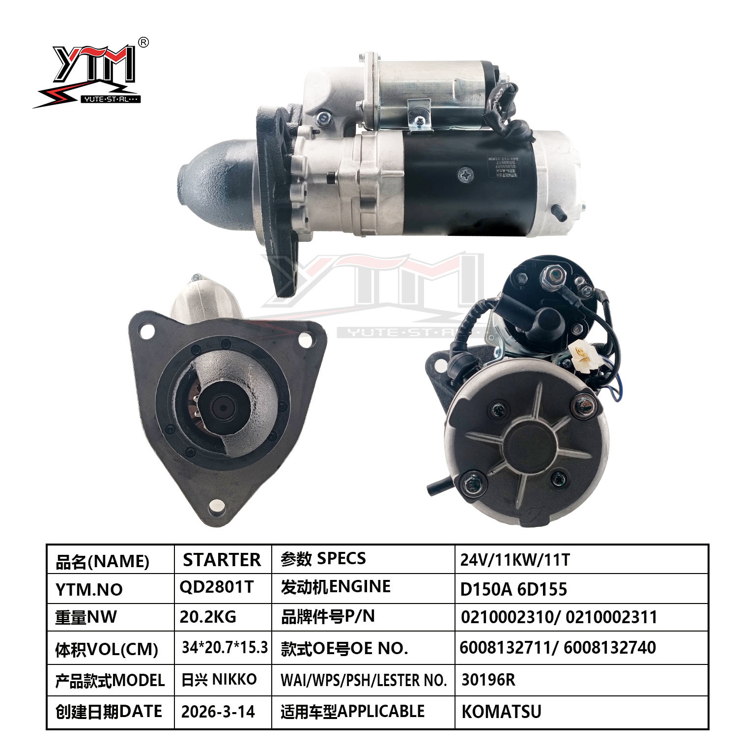| ハイライト: | 24V diesel engine starter motor,D150A 6D155 starter motor,NIKKO engine starter motor with warranty |
