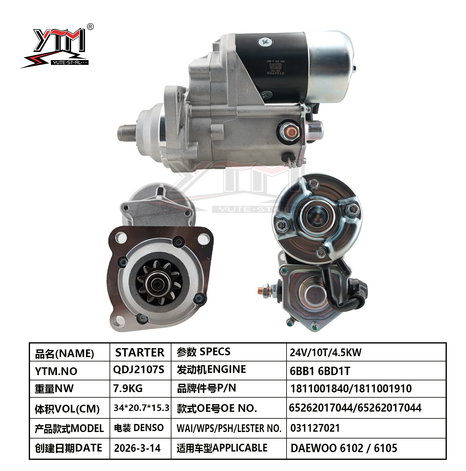 | ハイライト: | 24V diesel engine starter motor,DAEWOO 6105 starter motor,DENSO compatible starter motor |